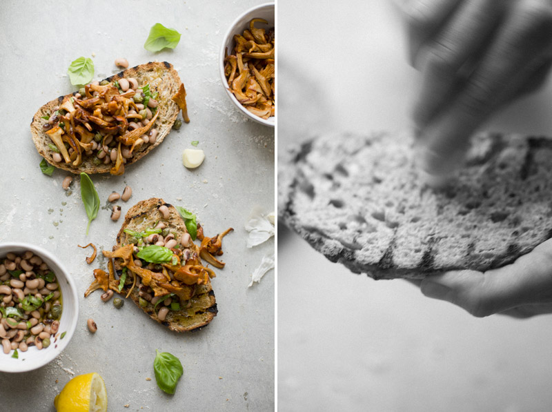 Chanterelles are very popular here in Sweden during August and September. Almost everyone I know has their own secret spot in the forest where they claim chanterelles grow like a yellow carpet. We don’t have any secret places like that. So when we can’t tag along some of our friends, we just go and buy a large bag of them at the market. One of the simplest yet most delicious way to eat chanterelles is stir-fried on a sandwich. So for dinner, we combined that Swedish chanterelle sandwich with a recipe for an Italian bean bruschetta that we sometimes make. The result was great. The beans added creaminess and tanginess and made it more into a dinner than just a sandwich. So, next time you feel like making a bruschetta, skip the tomatoes and try this bean and mushroom combo instead. We have included the recipes for both the bread and the bruschetta here. Happy weekend!